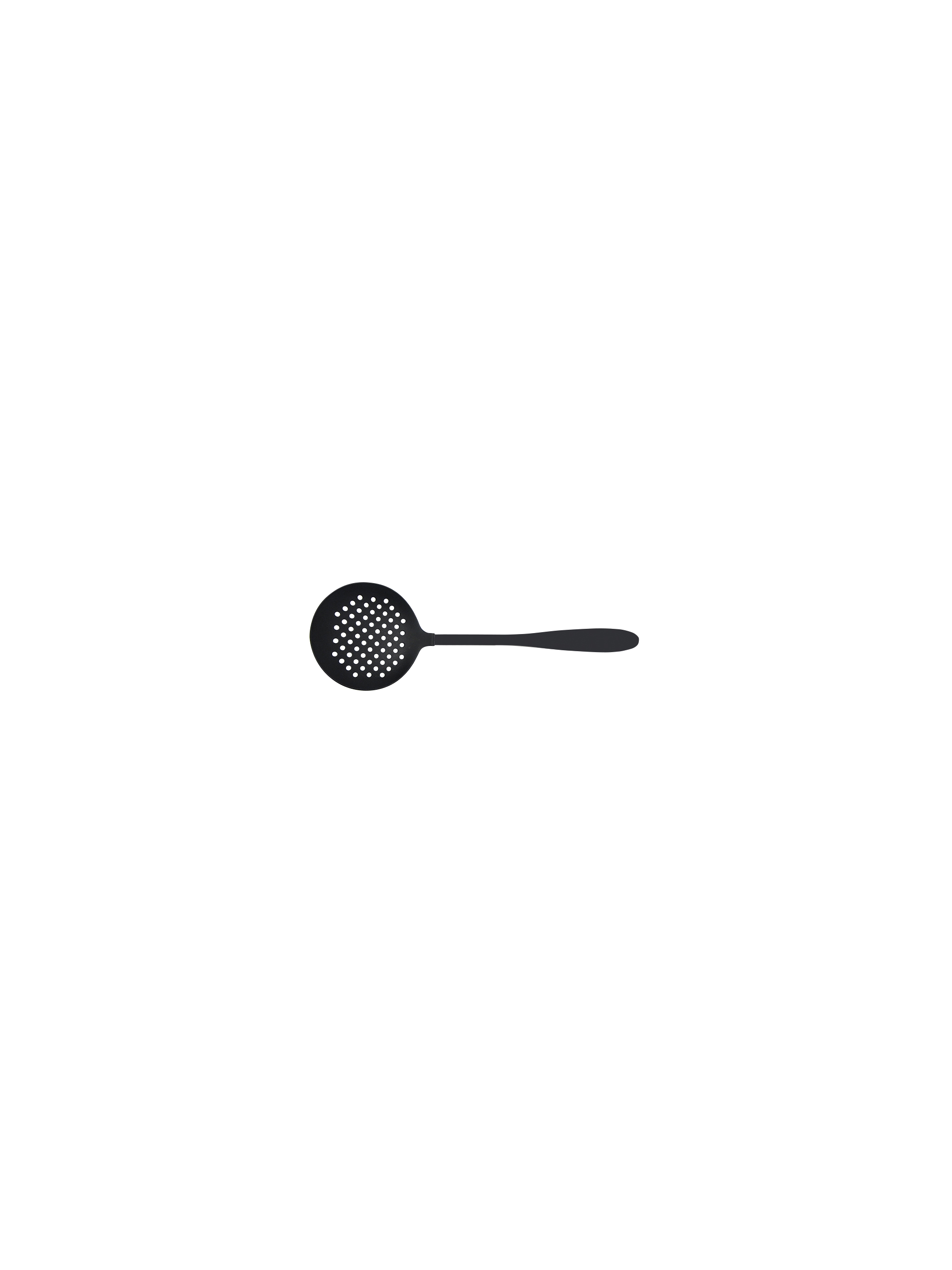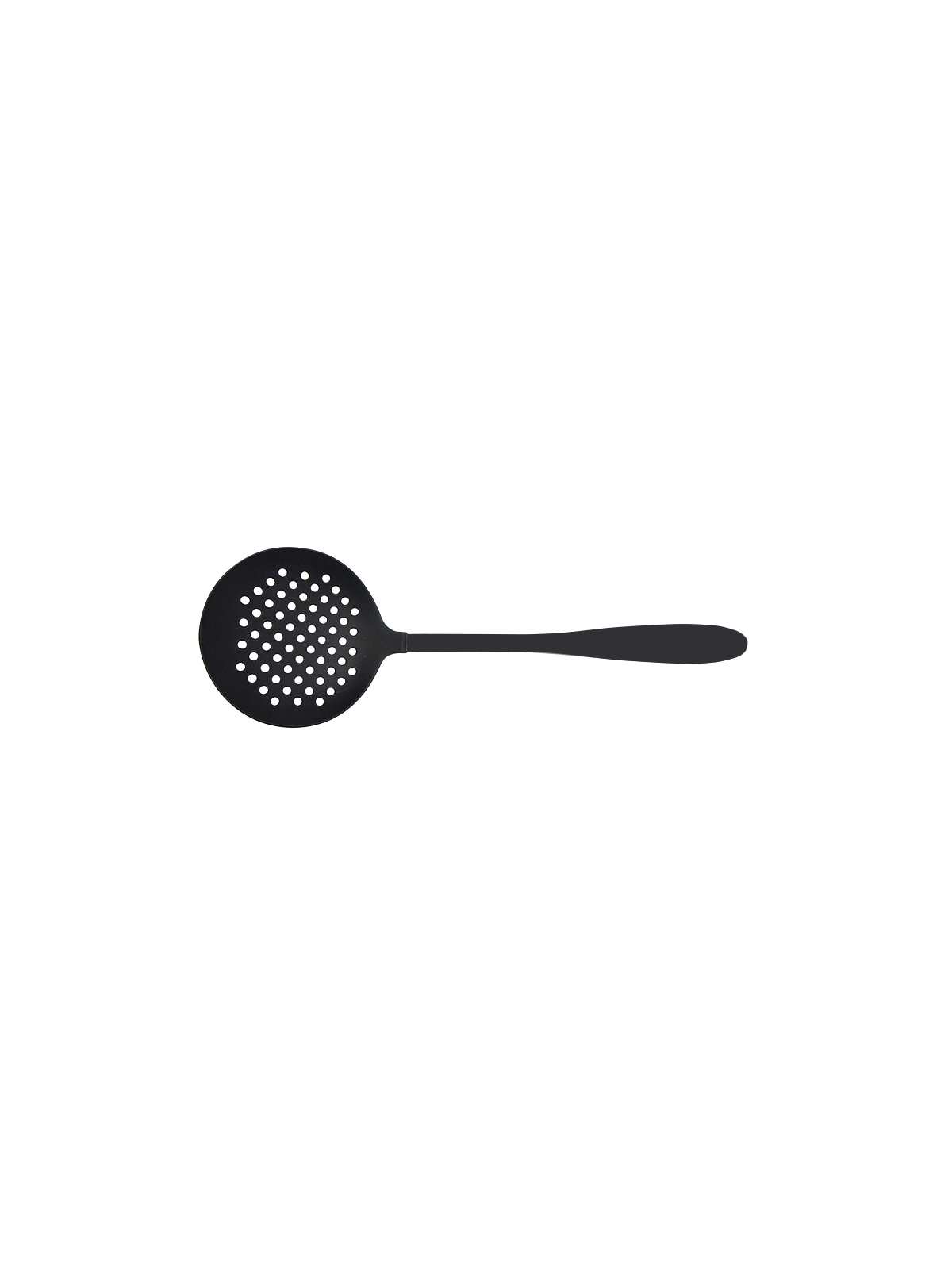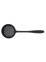 Spatule écumoire avec un manche en inox et un écumoire en plastique noir.